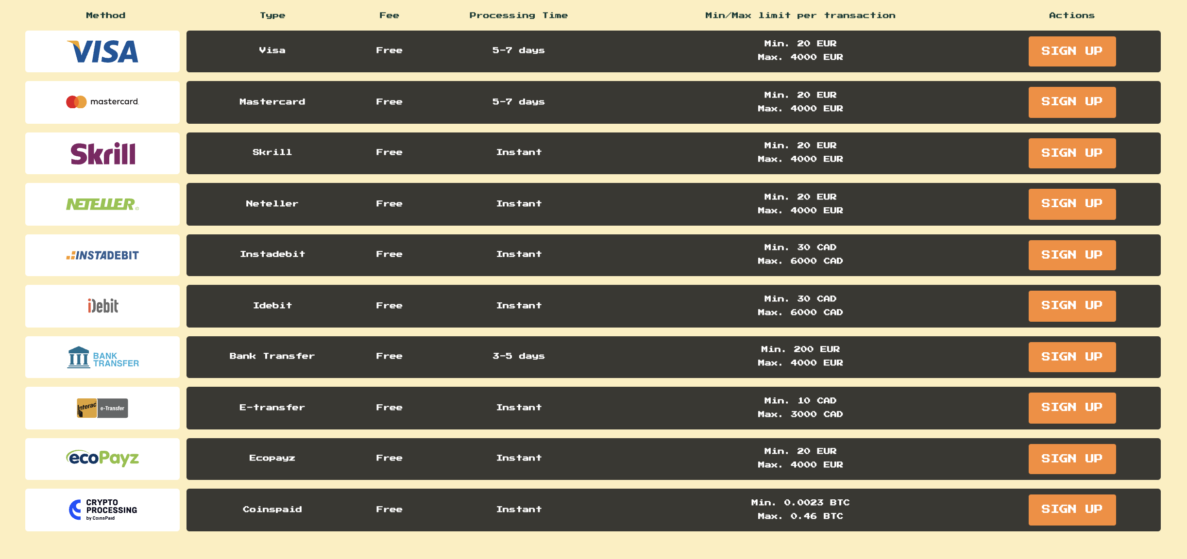 | Instadebit | Instant | Min. 30 CAD Max. 6000 CAD |